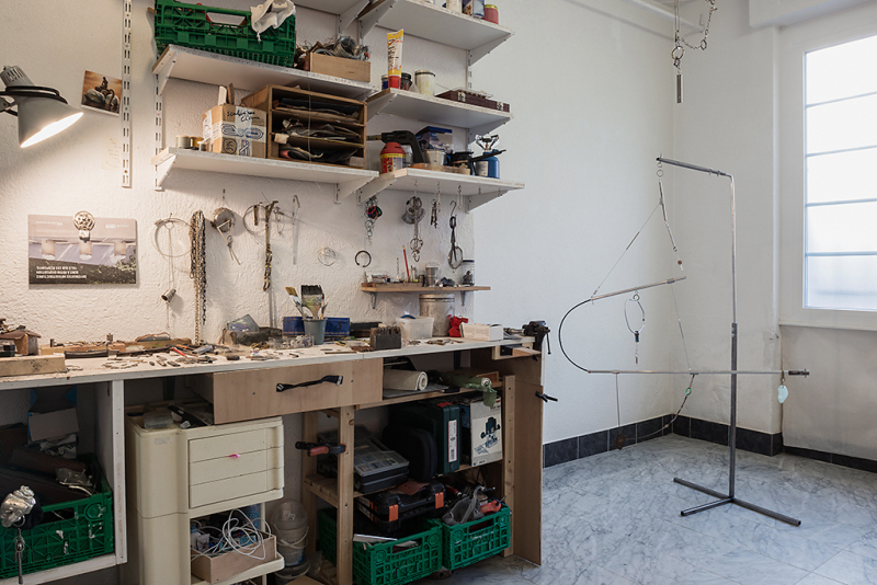 Léonie a donc un rapport très physique, presque charnel, avec ses matériaux et objets. Si le bois a - pour le moment - un peu disparu de sa « palette » de matériaux, supplanté par le métal, le plastique, la cire, les pierres de sel sculptées à l’eau et des petites pierres semi-précieuses qui apportent des touches de couleur raffinées, elle est devenue la reine de la récup, débusquant et collectant des bribes et objets abandonnés ou perdus. Elle les assemble et les imbrique pour en faire des objets singuliers, souvent des mobiles suspendus qui conjuguent le délicat avec le tranchant, le ludique avec le vaguement menaçant, le tendre avec le presque cruel.